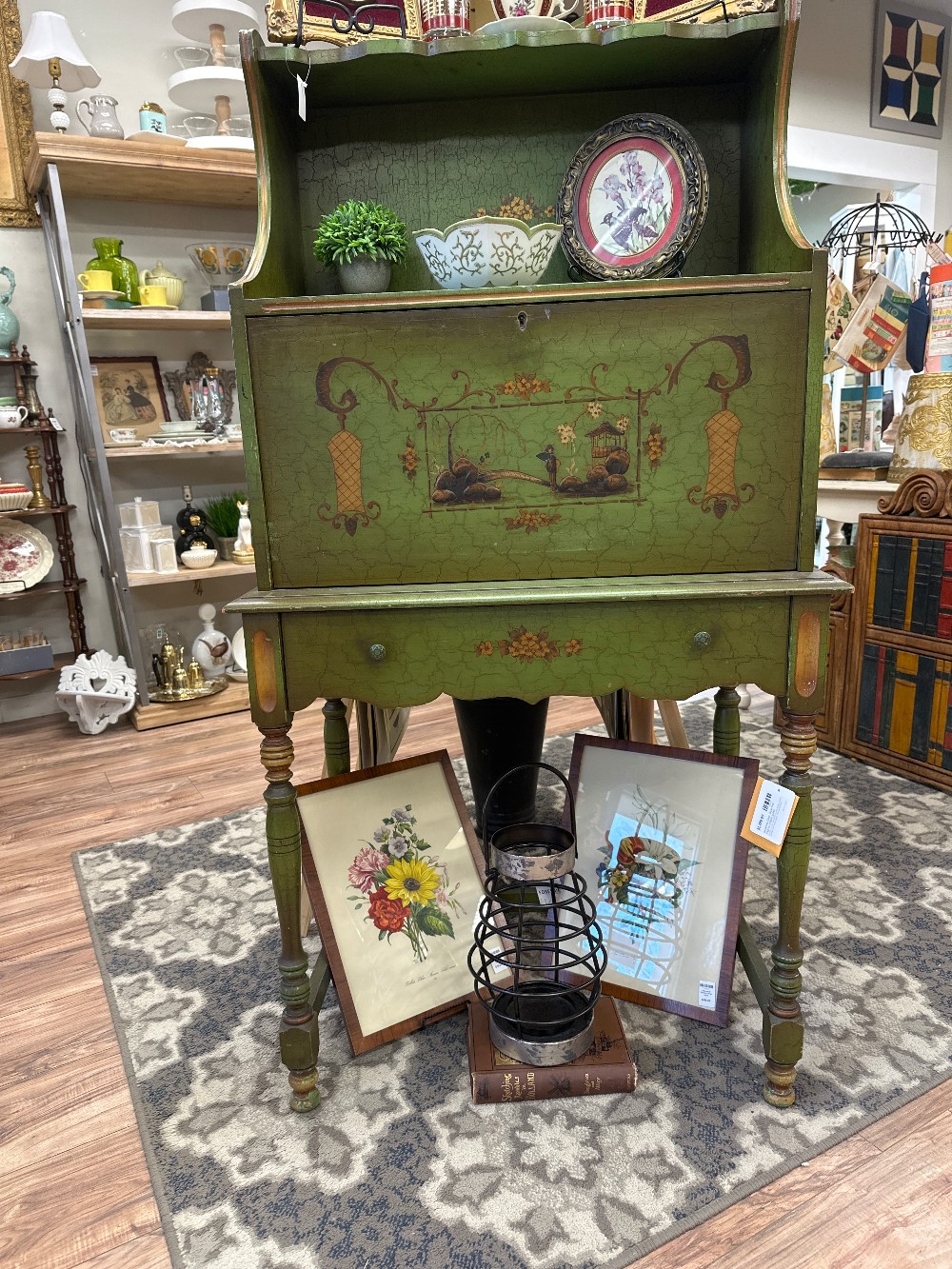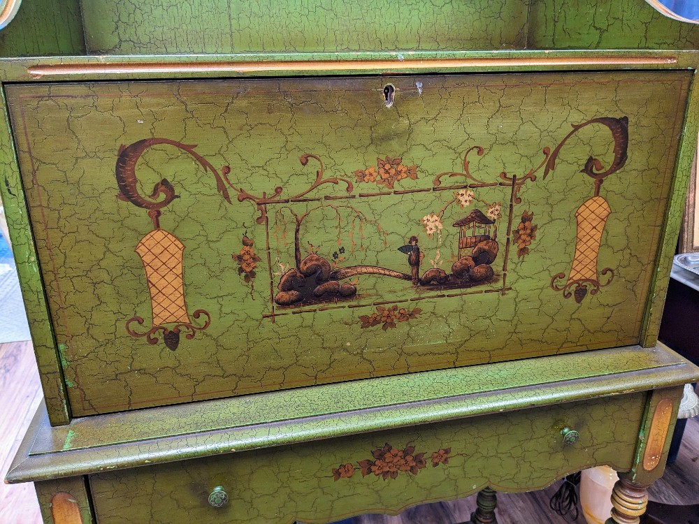 This antique secretary desk is a rare find - not a reproduction piece. Original chippy green paint with handpainted tole details. Dovetail joinery and stamped drawer, assembled with flathead screws all point to older craftsmaship. A gorgeous, must-see piece.