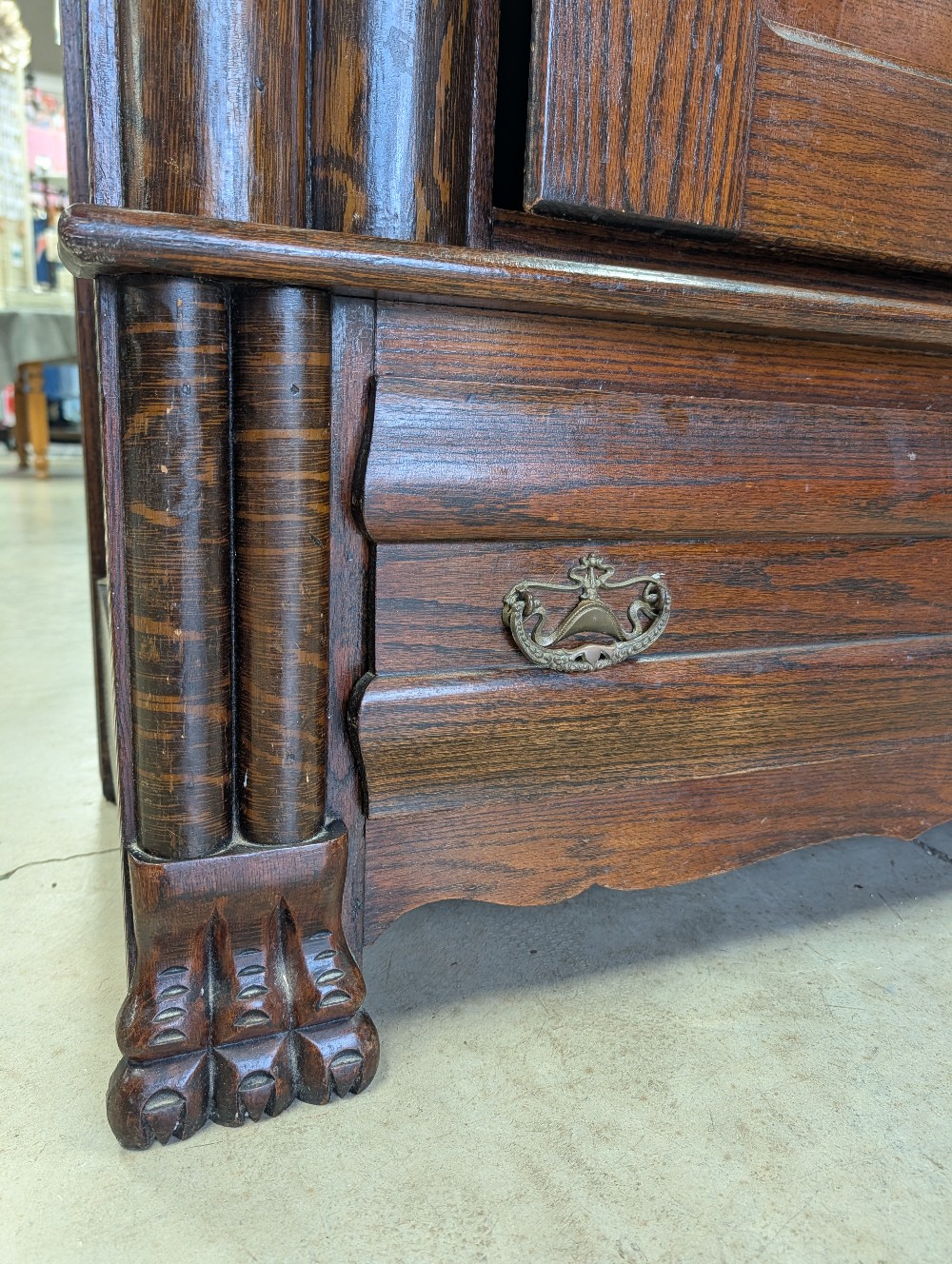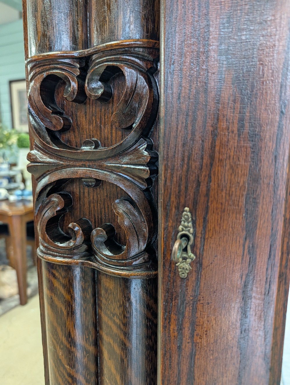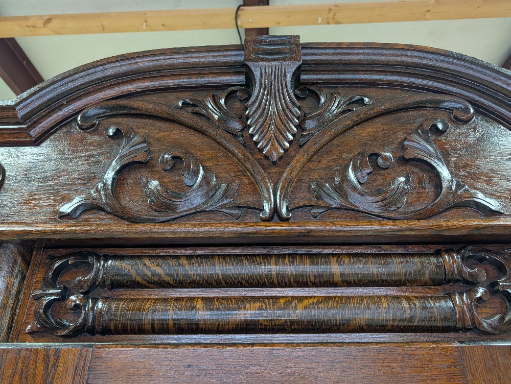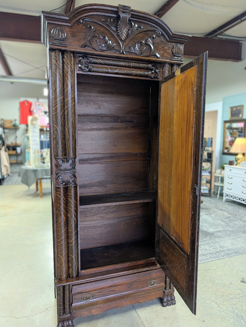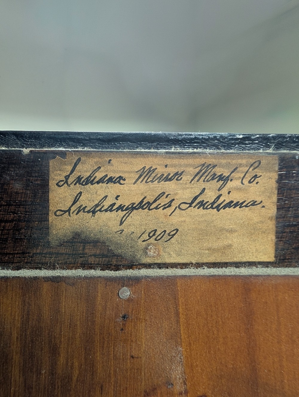 Stunning turn of the century wardrobe with intricate carved detailing, beveled mirror, and abundance of charm! Marked Indiana Mirror Manufacturing Co, 1909, Indianapolis, IN