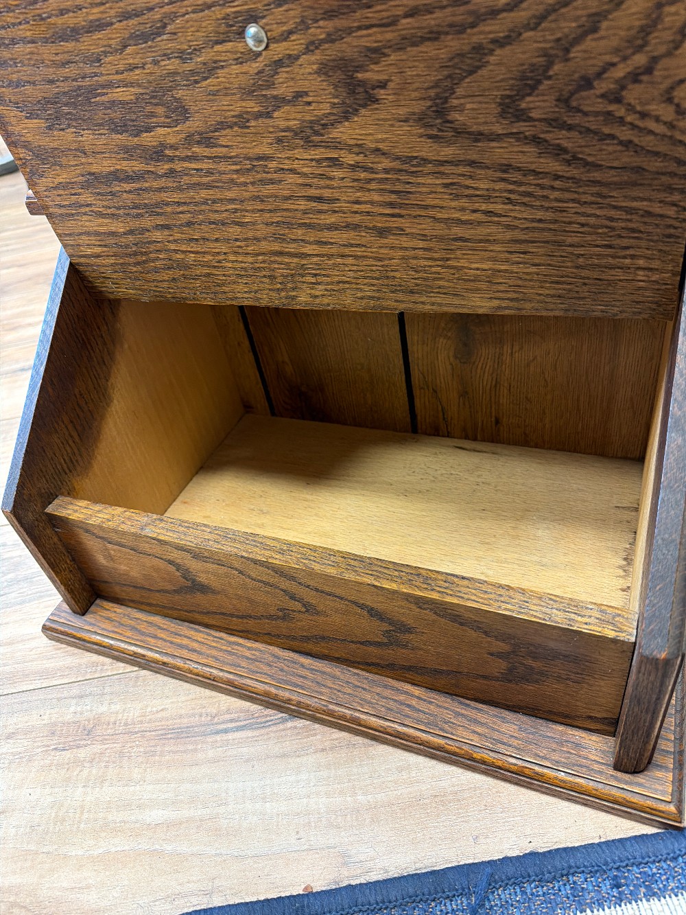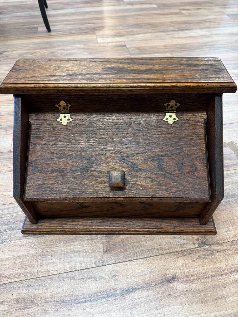 Solid wood vintage bread box. Sweet square knob and unique gold hinges.