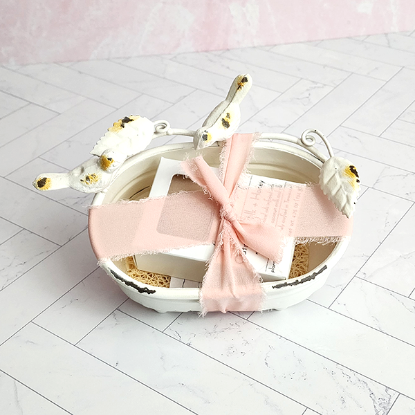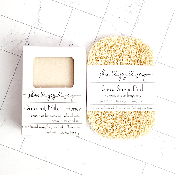 This 3-piece gift set includes a darling farmhouse soap dish (made of metal, drain hole in the bottom), a neutral colored soap saver pad, and customer favorite Oatmeal Milk and Honey Everyday Joy Collection bar soap. Ribbon color may vary by season.