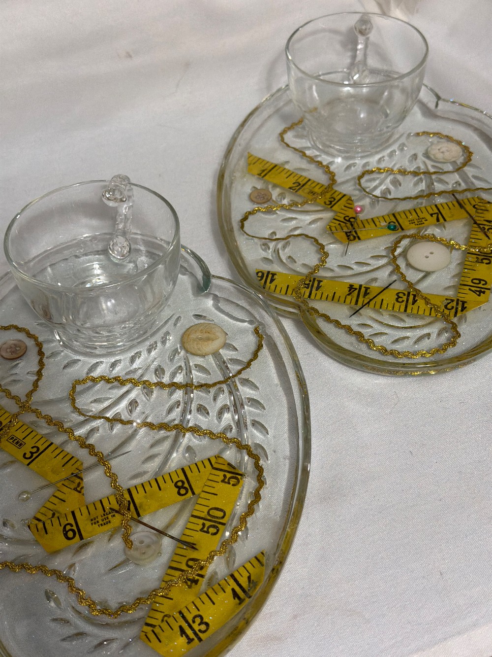 10” x 7” vintage glass snack tray with cup. Decorated with sewing notions. All sealed in resin. Perfect for a side table to hold all your sewing needs like needles, tread, pins and scissors.