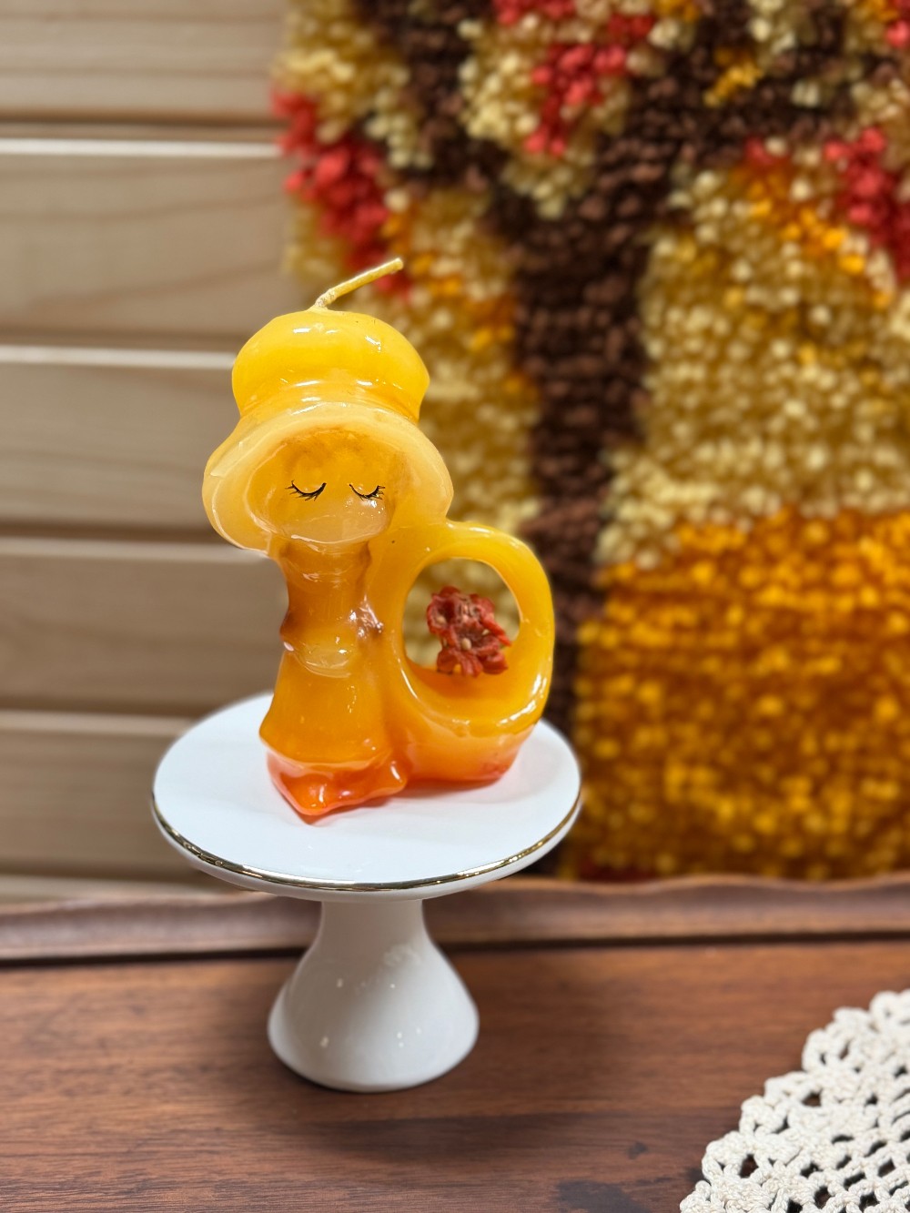 Vintage Sunset wall hanging latch hook rug & candle