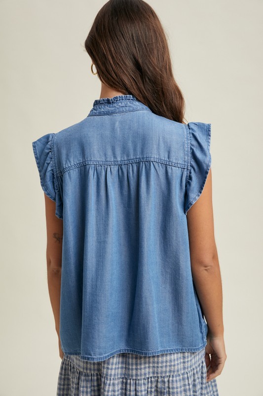 Sweet with a touch of classic denim charm 💙 This Denim Ruffle Sleeve Button-Up Blouse features soft denim fabric and feminine ruffle sleeves for an elevated everyday look. Functional front buttons make it easy to style tucked, tied, or worn open over your favorite tank. Perfect for pairing with shorts, white denim, or your go-to jeans for effortless, casual style.